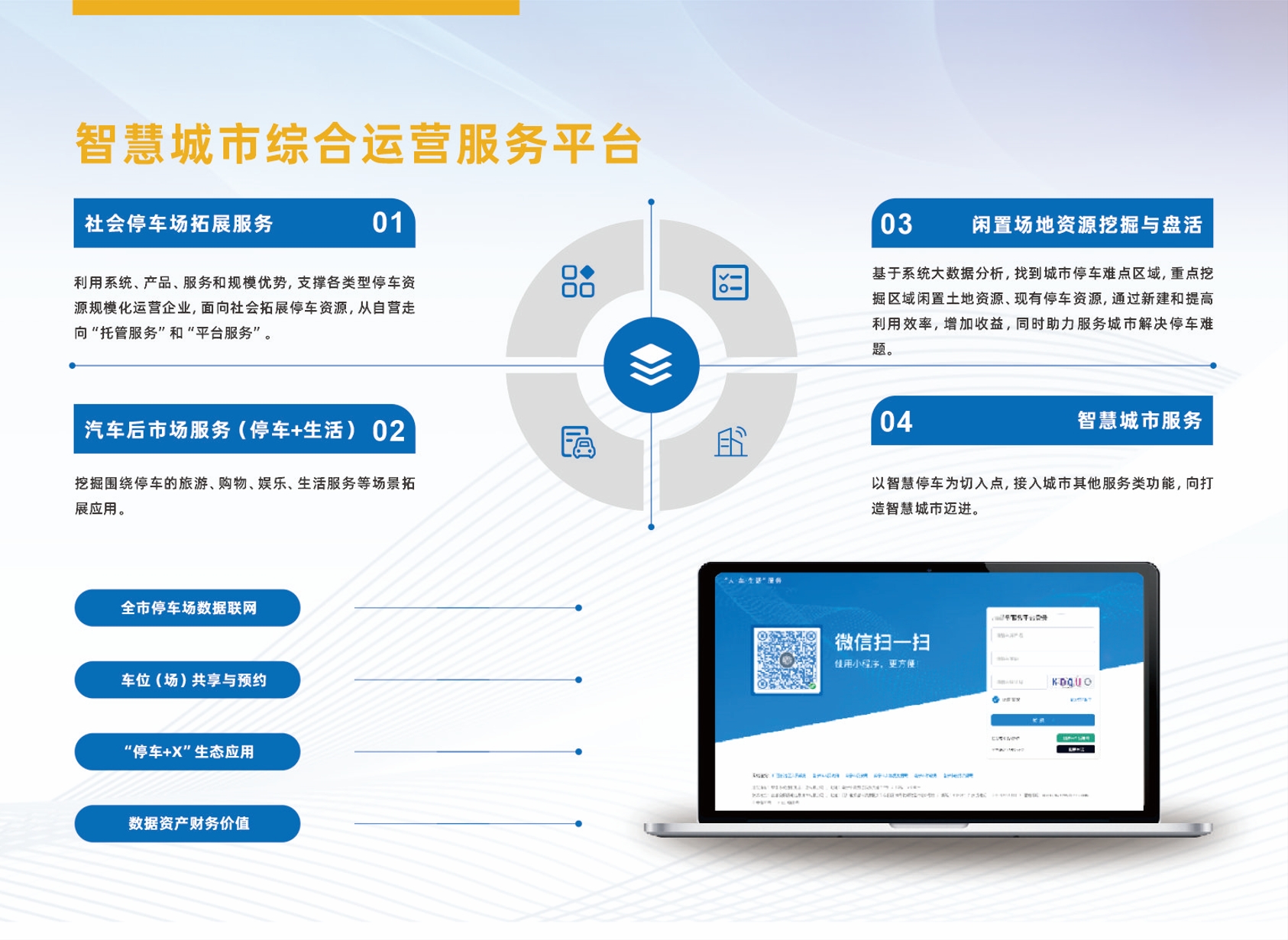 智慧城市综合运营服务平台具备促进城市从停车运营向智慧城市产业生态运营拓展延申功能。