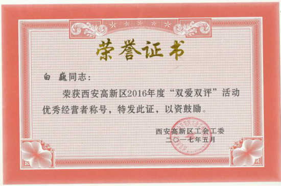 2017年8月14日,西安高新区工会工委颁发了《西安高新区工会工委关于表彰2016年度基层工会目标责任考评先进单位的决定》和《西安高新区工会工委关于表彰2016年度“双爱双评”活动先进个人的决定》的文件。